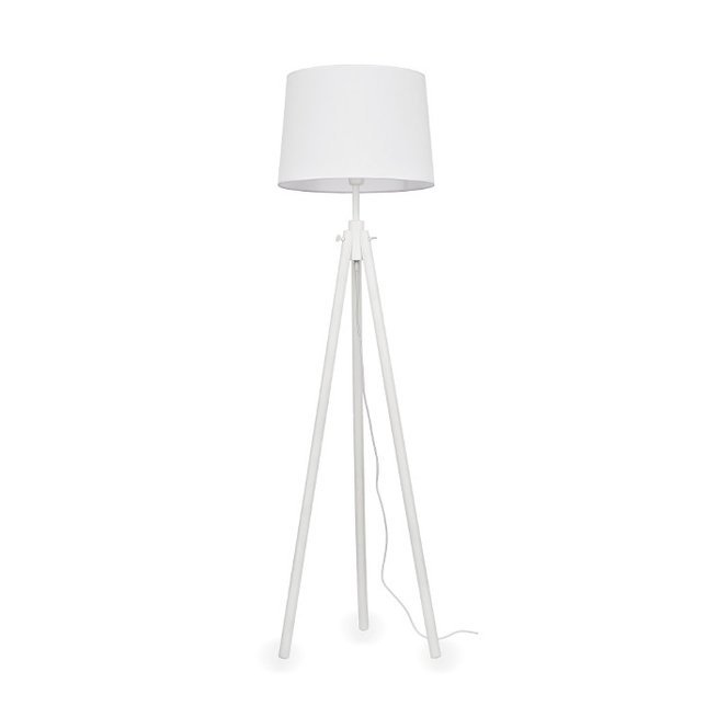Natural wooden tripod stand with metal details. PVC foil shade coated with fabric. Power cable coated with fabric. Available also with white or black shades and frame.